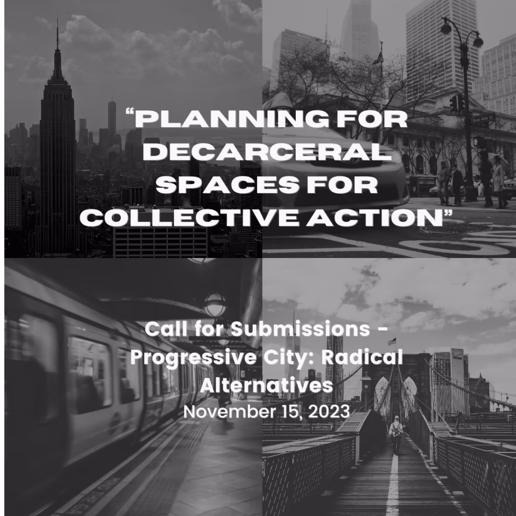 We are seeking short submissions (roughly 1,000 words) for our online magazine, Progressive City: Radical Alternatives, on the theme of ‘Planning for Decarceral Spaces for Collective Action.’ Contributions can reflect on this theme through a variety of lenses, but should address how planners and activists can actively engage in designing, creating policies, and/or advocating for the creation of decarceral spaces which promote safety, reduce harm, and are accessible.