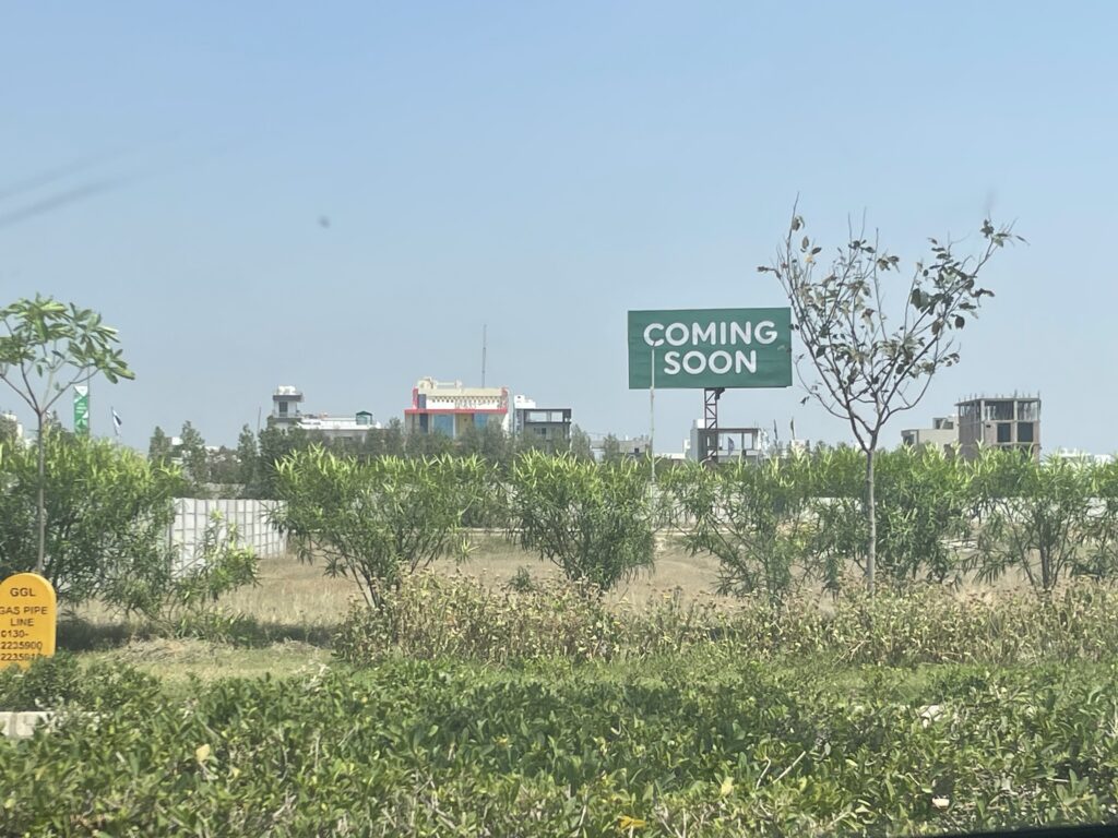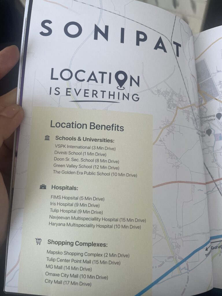 These education hubs have led to gentrification through the proliferation of high-rise apartments in residential areas. For instance, “Jindal Global City” was established in Sonipat by Jindal Steel, one of India’s wealthiest industrial conglomerates, adjacent to a university owned by the same industrial group. Strategic marketing by real estate agencies and universities taps into the aspirations of the burgeoning middle class, playing a crucial role in shaping these urban spaces. Residing in such spaces has become a status and class marker. Brochures shared with me by a local real estate broker tout the “exclusivity” and “security” of gated communities, highlighting their proximity to the education hub and “international schools.”